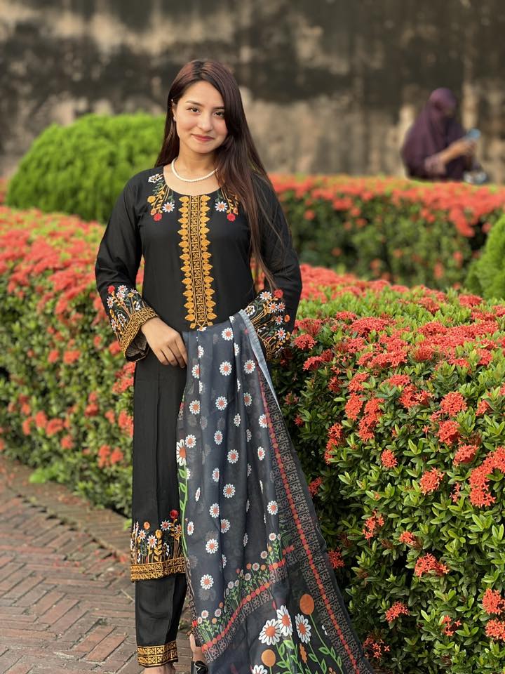 কালো পোশাকে ফুলের এমব্রয়ডারির ঝলক — ঠিক যেমন কোমল, তেমনই রুচিশীল! 🖤✨