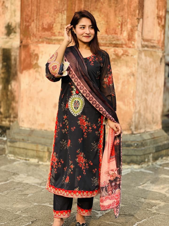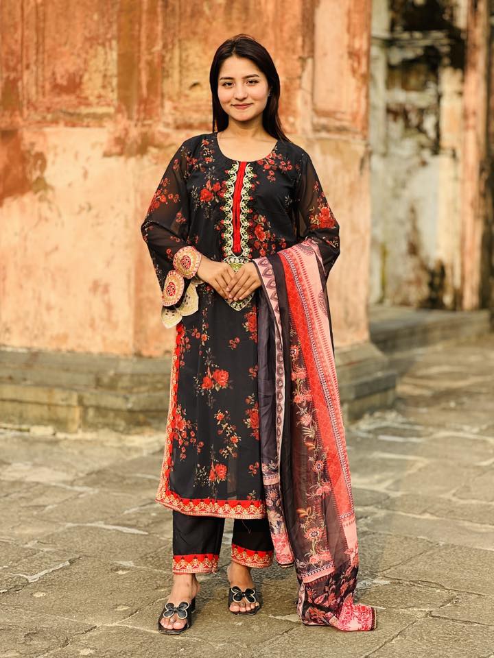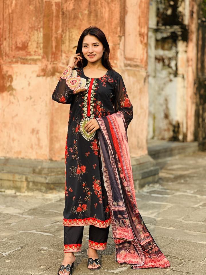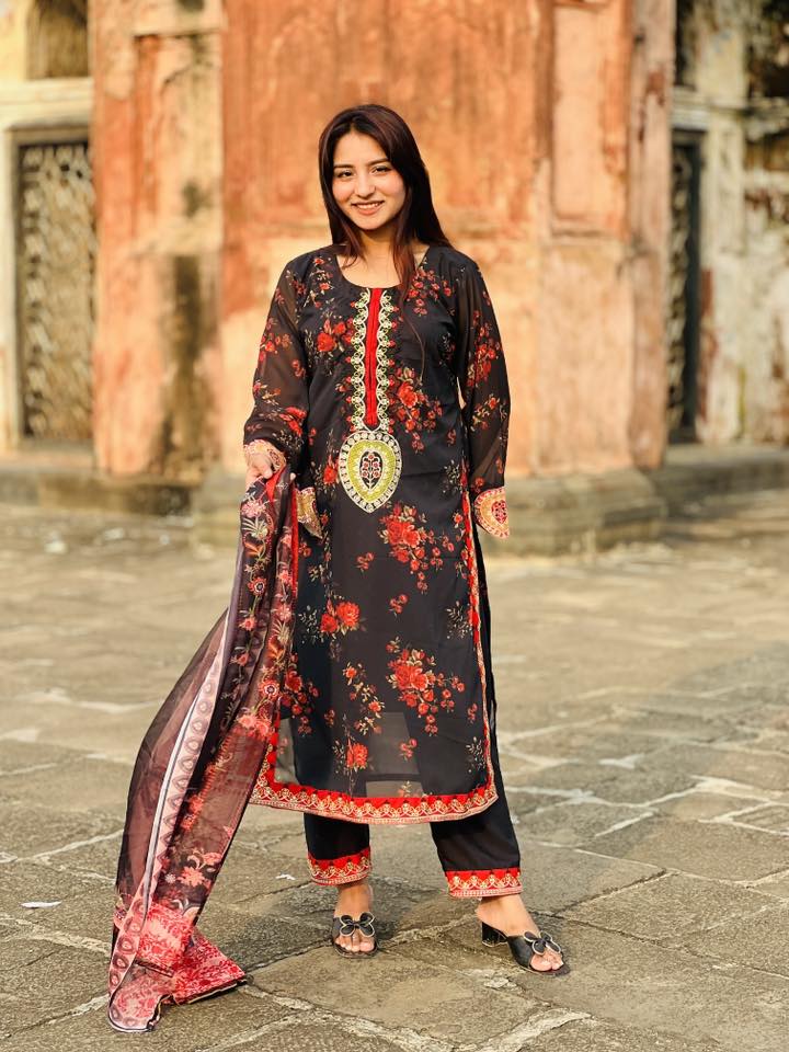 এই চমৎকার ব্ল্যাক অ্যান্ড রেড ফ্লোরাল সেলোয়ার কামিজ সেটটি প্রতিটি স্টাইলপ্রেমী নারীর জন্য একদম পারফেক্ট। কালো বেসের উপর লাল ফুলের প্রিন্ট ও গলায় সুন্দর এমব্রয়ডারি একে দিয়েছে রাজকীয় ডিজাইন । 🌺